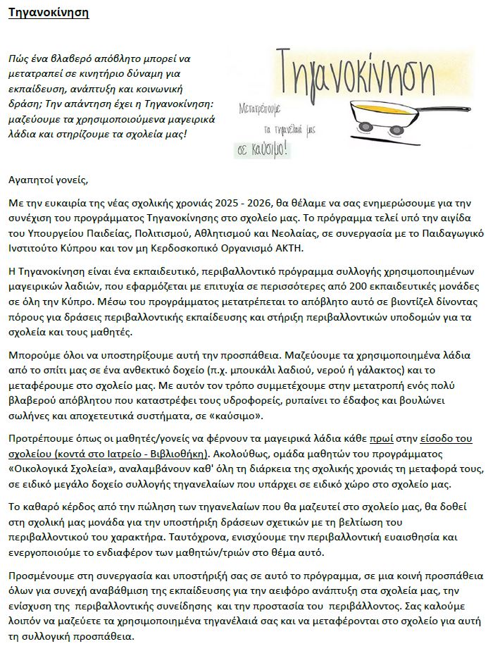 Η επιστολή που στάληκε στου γονείς αρχές της σχολικής χρονιάς σχετικά με την τηγανοκίνηση