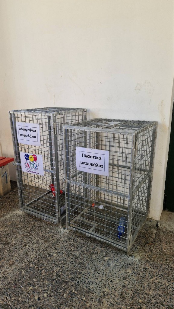 Κατασκευή μεγάλων κάδων ανακύκλωσης για πλαστικά και αλουμινένια τενεκεδάκια και τοποθέτησή τους στην αυλή του σχολείου.